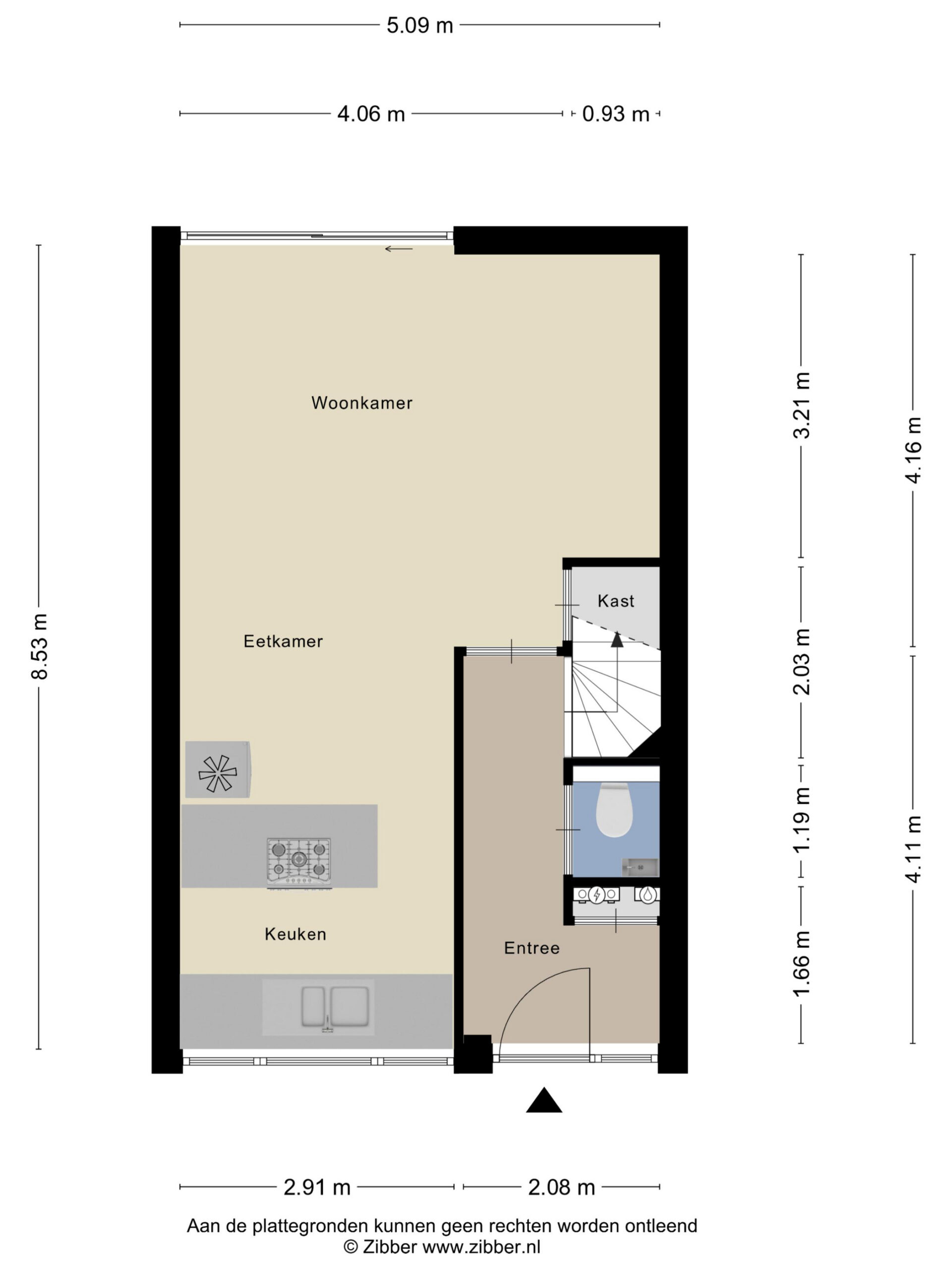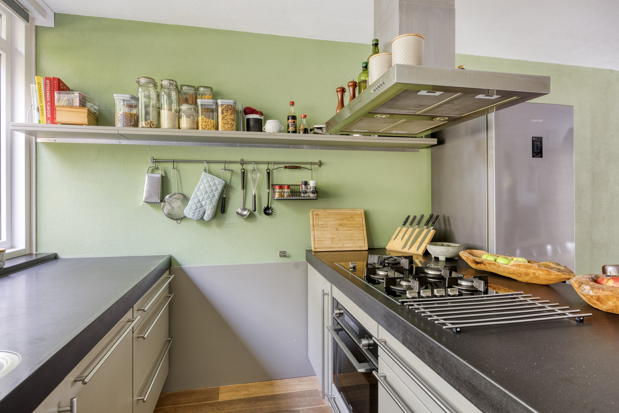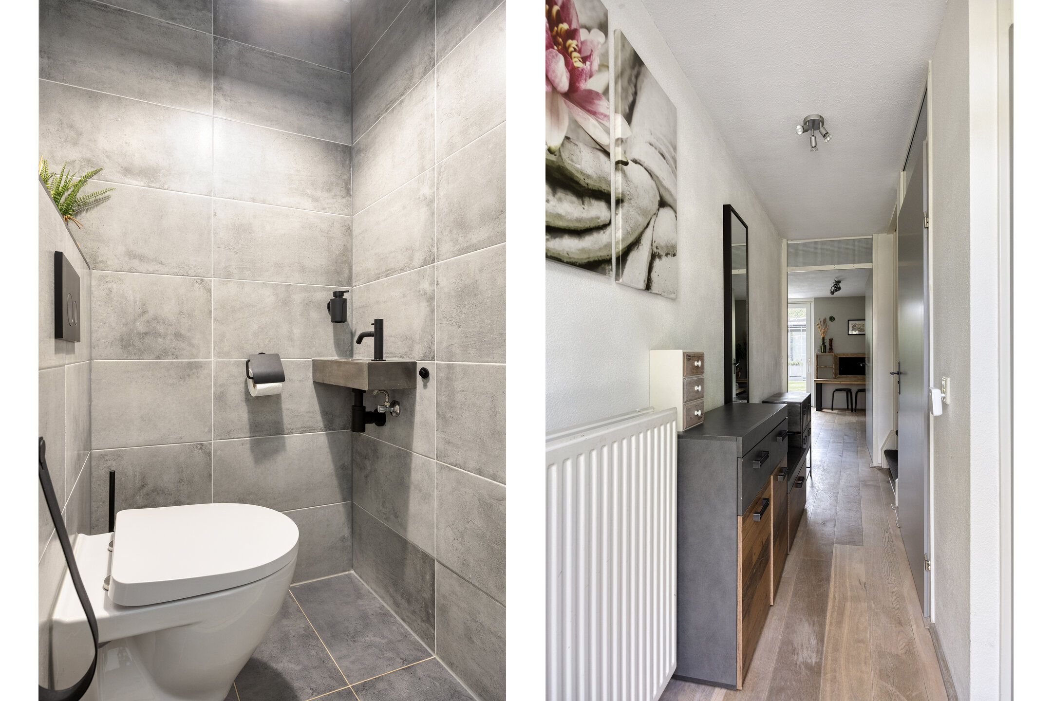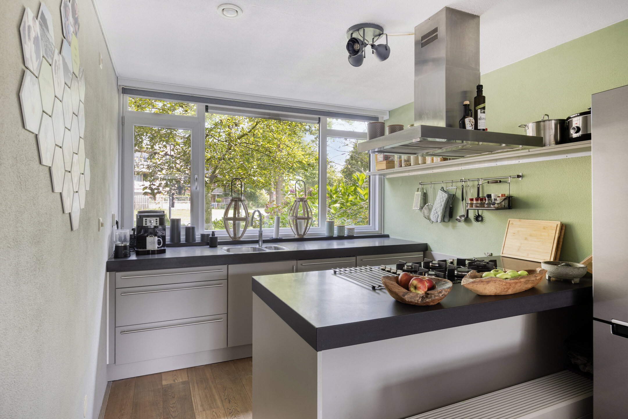 Entree, hal, toilet met fonteintje, meterkast, trapopgang en toegang tot de ruime woonkamer voorzien van trapkast en schuifpui naar de tuin. De moderne open Siematic keuken is voorzien van diverse inbouwapparatuur: vaatwasmachine, gaskookplaat, wasbak met Quooker, combi oven/magnetron en koelkast.