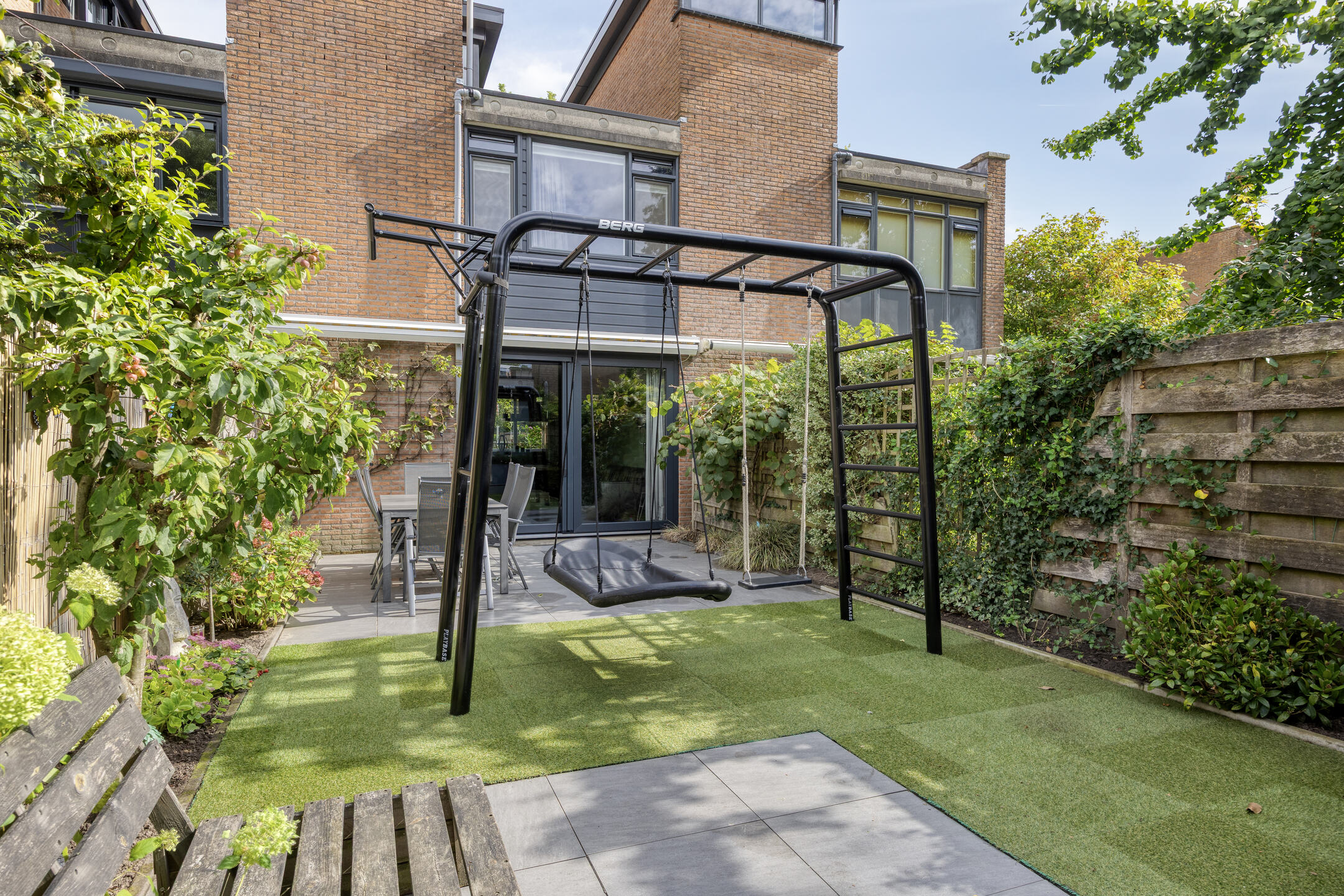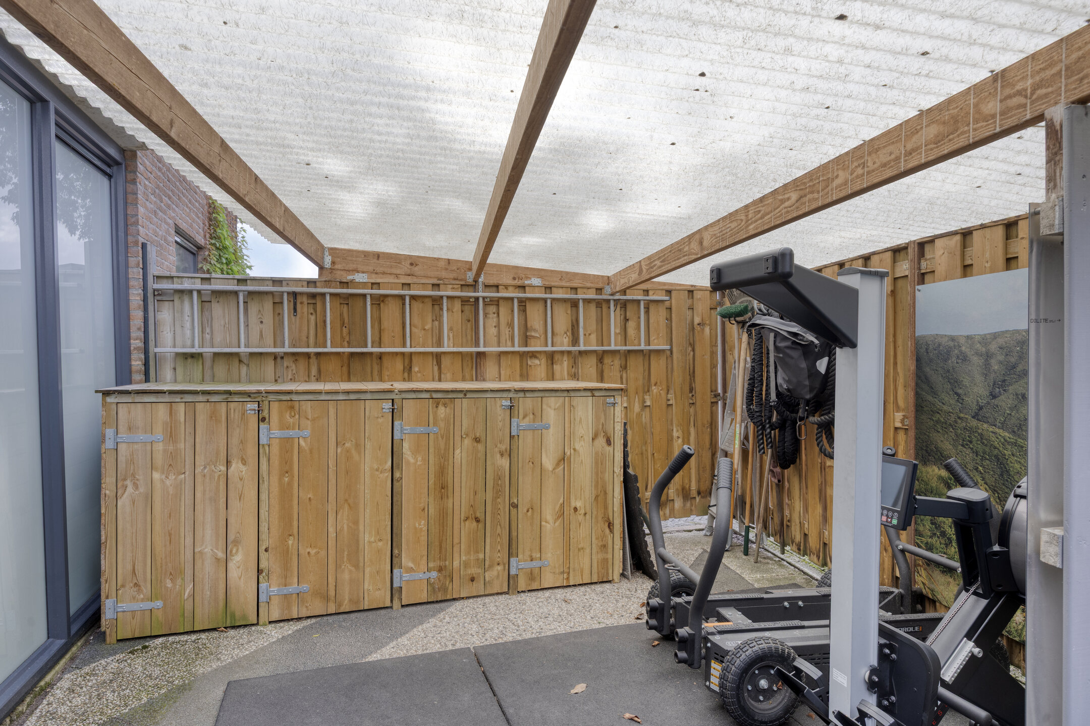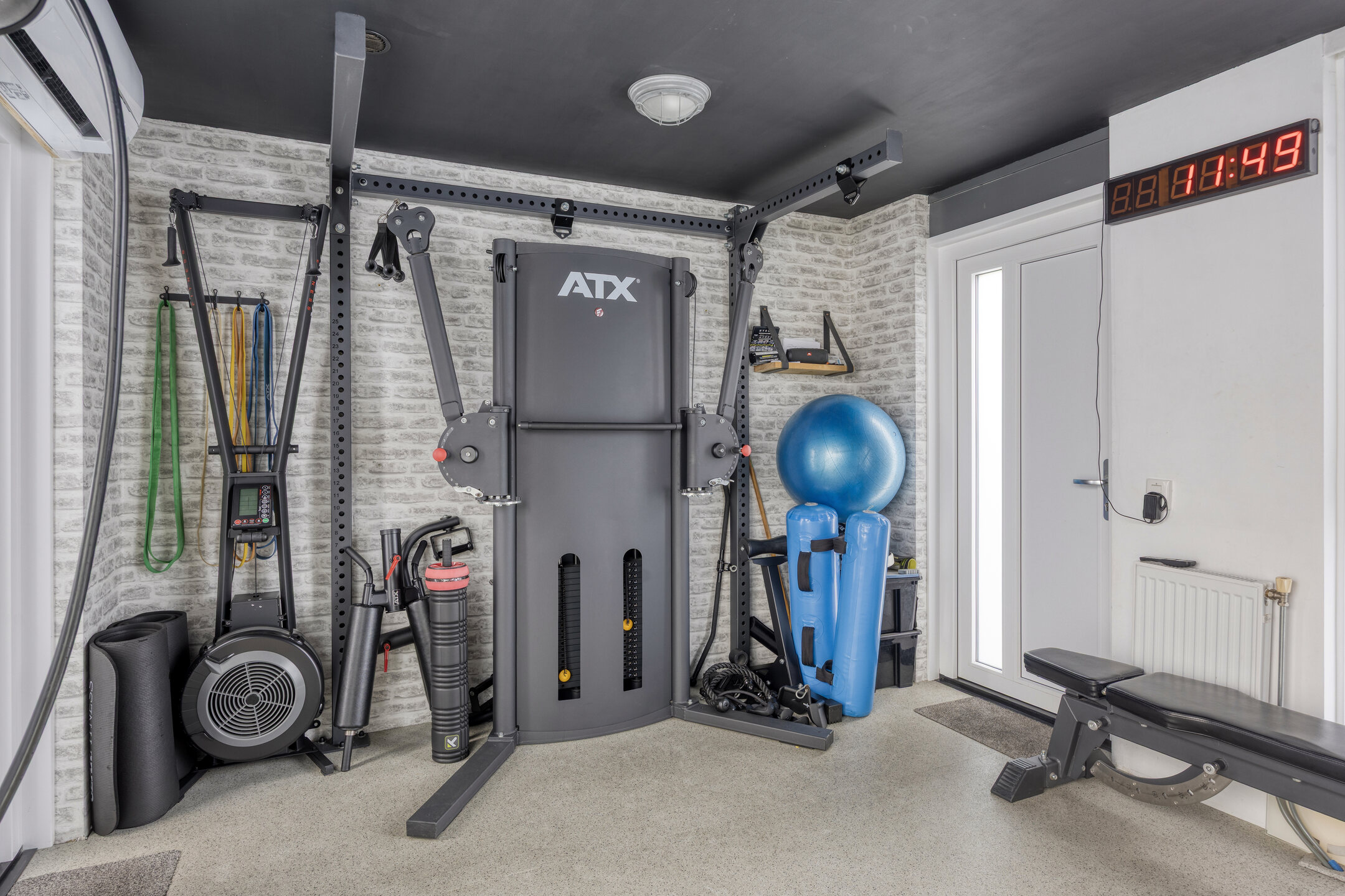Aan de achterzijde van de tuin is een vrijstaand atelier/fitnessruimte voorzien van elektra en verwarming. Deze ruimte is eveneens vanaf de straatzijde te bereiken. Hier is tevens een afdak als bergrui.