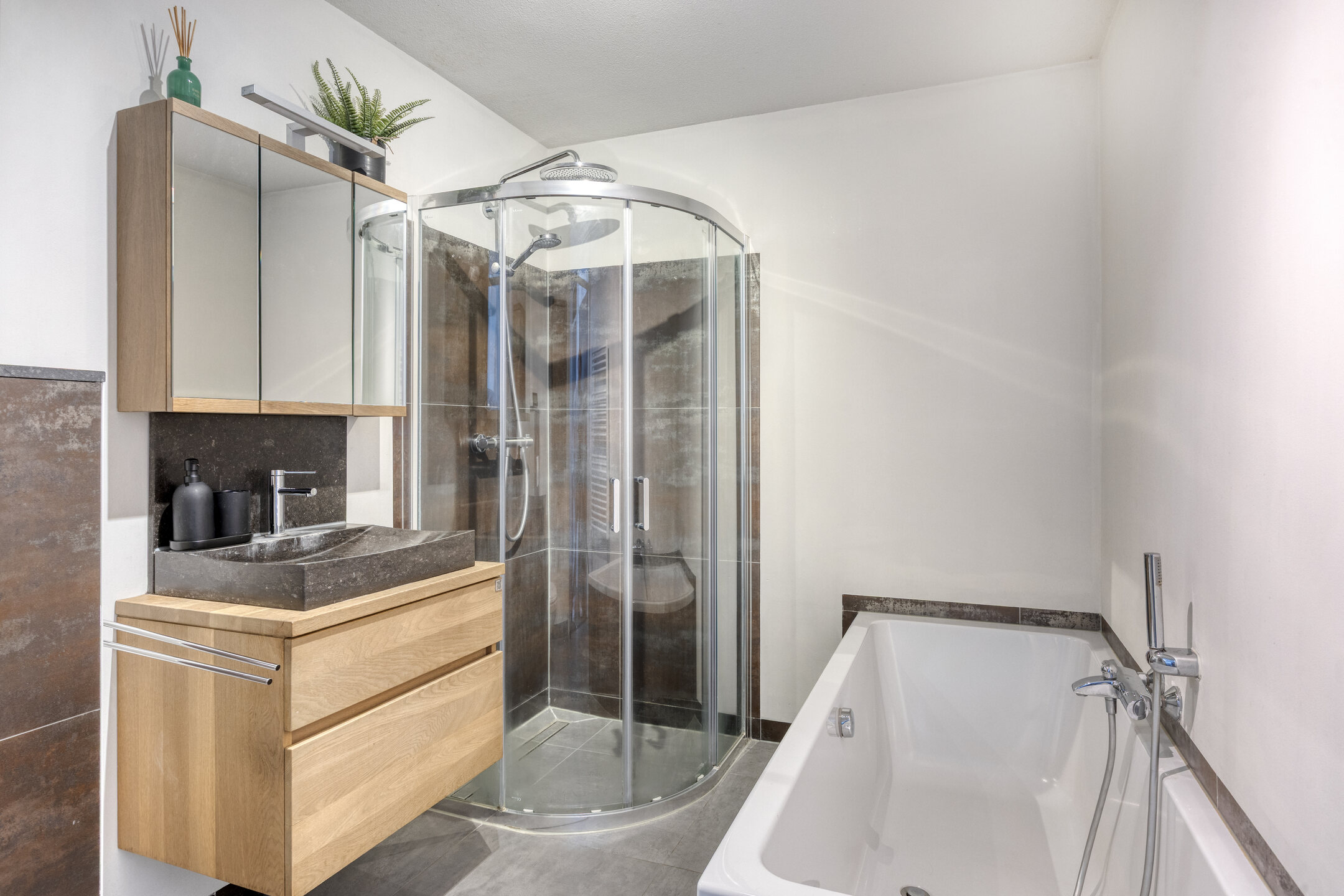 Overloop, 3 slaapkamers en ruime badkamer met ligbad, aparte douchecabine, wastafelmeubel met spiegelkast en 2e toilet.