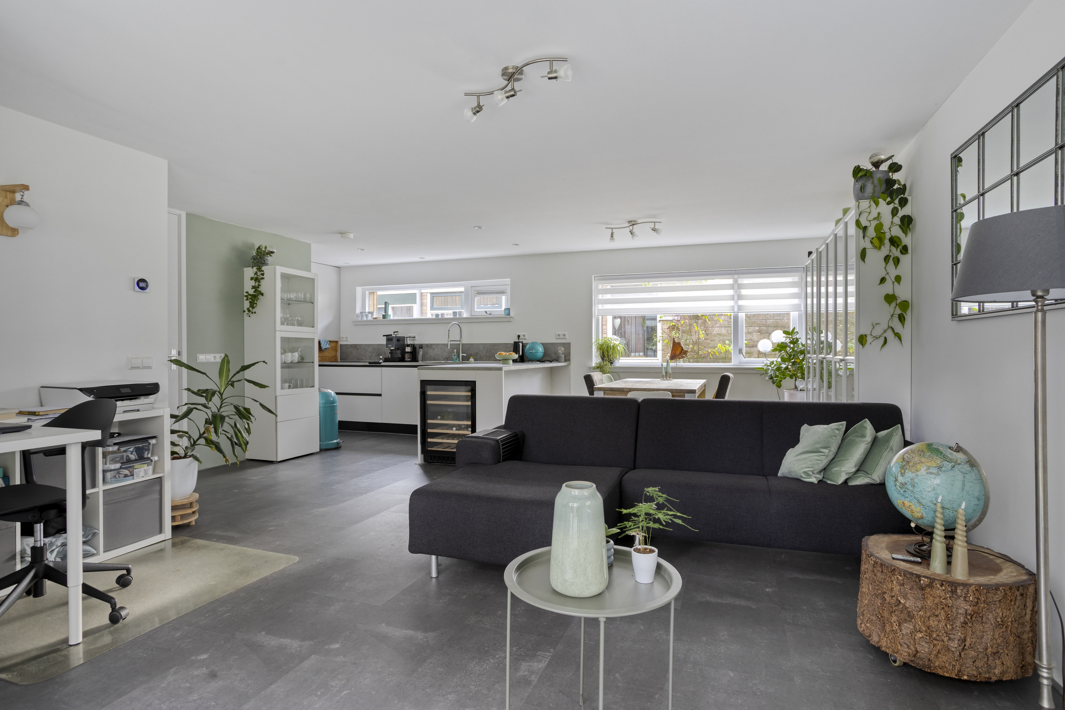 Vanuit de hal komt u in de lichte woonkamer met vloerverwarming en schuifpui naar de tuin. De woonkamer gaat over in de ruime en luxe uitgevoerde open keuken. De keuken is voorzien van een een inductiekookplaat met geïntegreerde afzuiging, een hetelucht- en een stoomoven, vaatwasser, koelkast met vriezer en een wijnklimaatkast. Ook is er in de keuken een extra bergkast.
