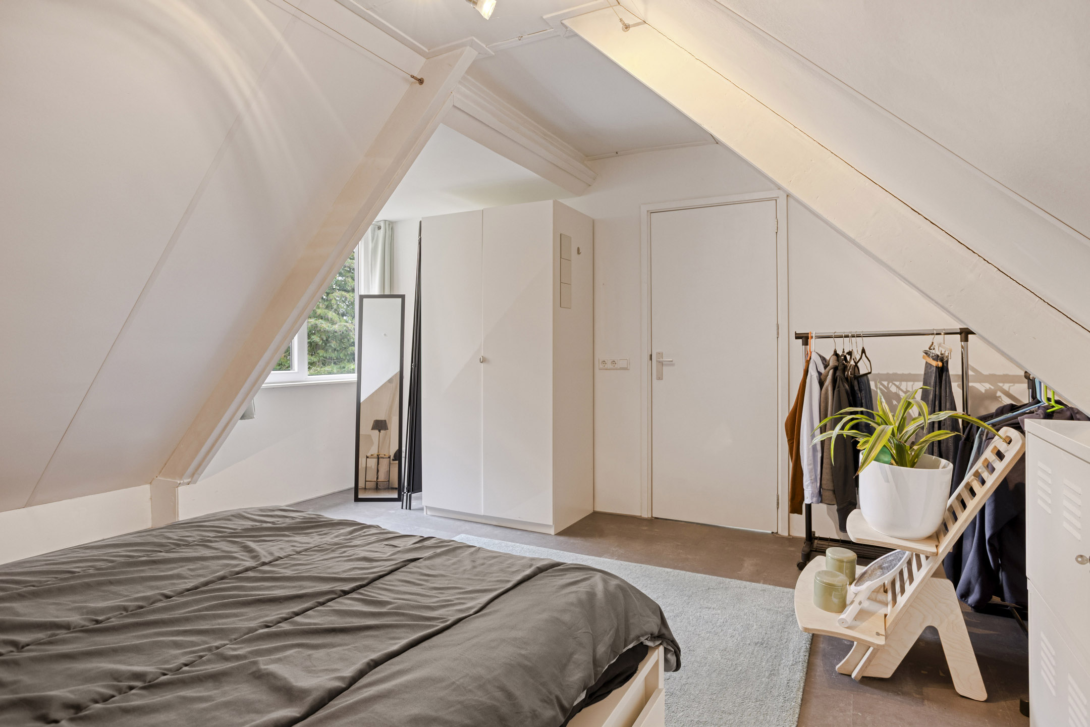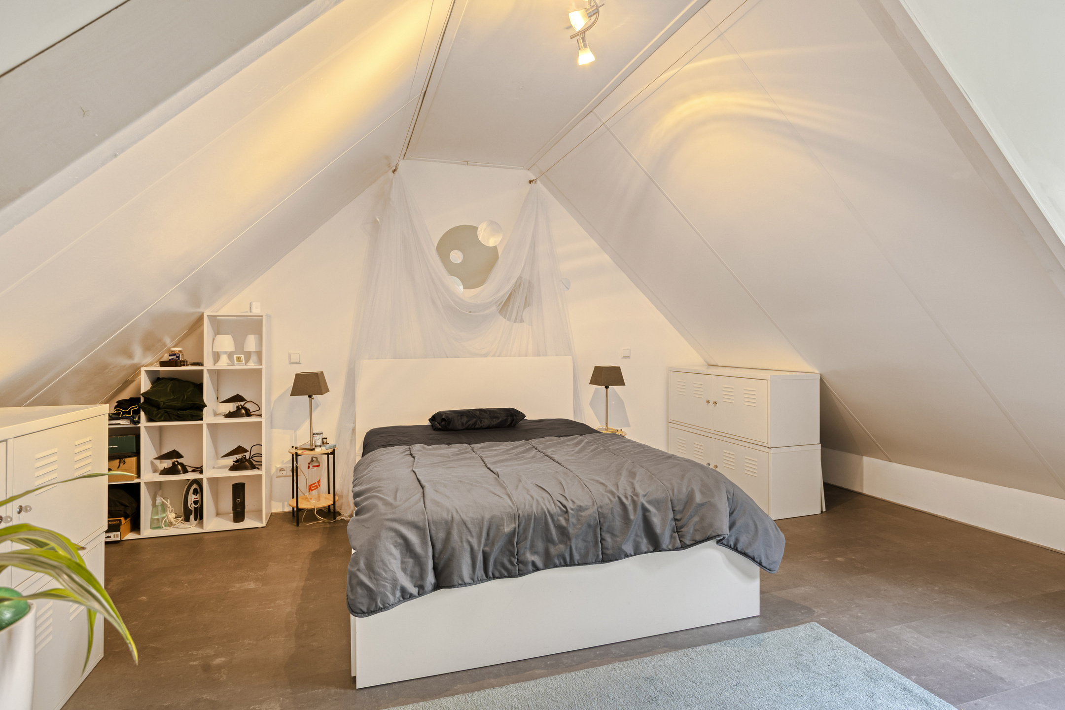 Via de trap komen we op een overloop met een ruime praktische berging met hierin de aansluitingen voor de wasmachine en de wasdroger. Er is één ruime slaapkamer en een badkamer met douche, wastafel met bergmeubel en een tweede toilet.