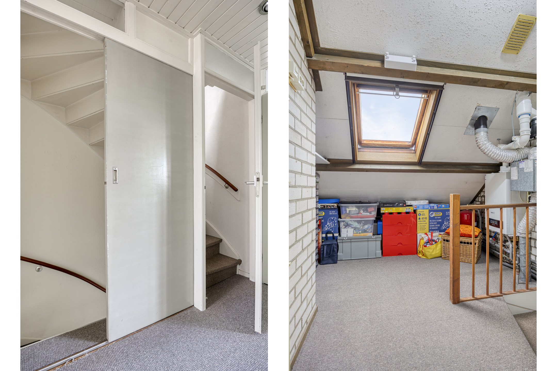 Ruime voorzolder met dakraam, opstelling van de cv-ketel (2023) en de aansluiting voor de wasmachine. De zolderkamer heeft aan beide kanten een dakkapel en is voorzien van airco.