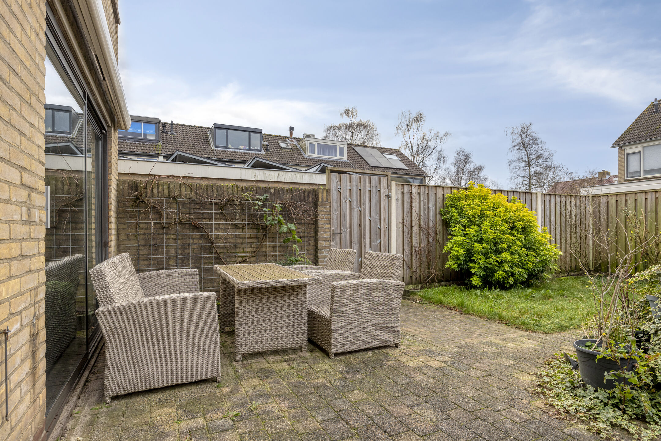 De tuin met achterom is bijna 10 meter diep, gelegen op het zuiden en aangelegd met een terras, gras en borders. Hier staat ook een ruime stenen berging van ca. 10 m2 met elektra en een werkbank.