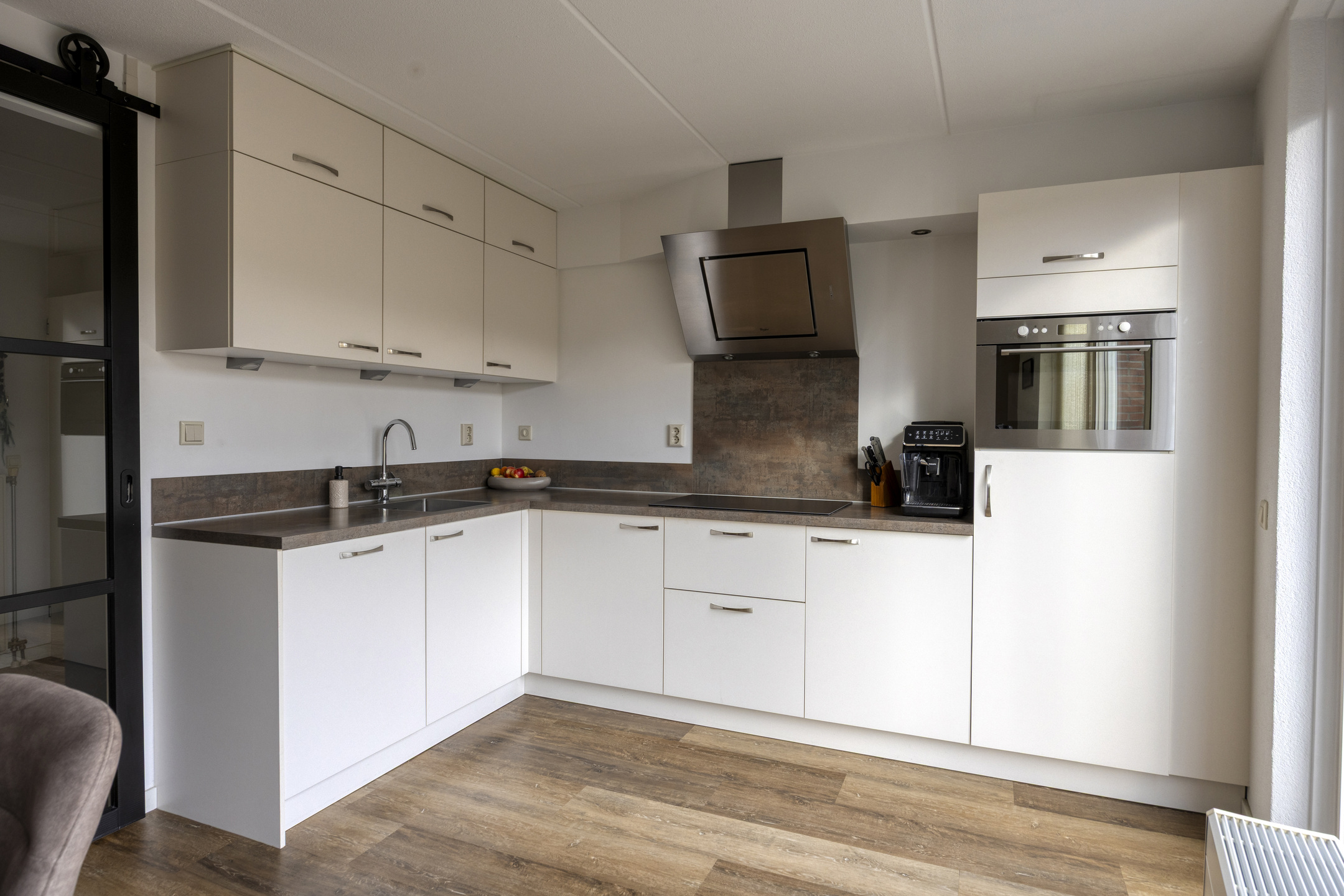 Begane grond: Entree met meterkast, hal met toilet en trapopgang, woonkeuken voorzien van een hoekkeuken in een lichte kleurstelling. Aansluitend aan de keuken is het terras aan het water. De inpandige garage is verbouwd tot een berging en inpandige kamer.